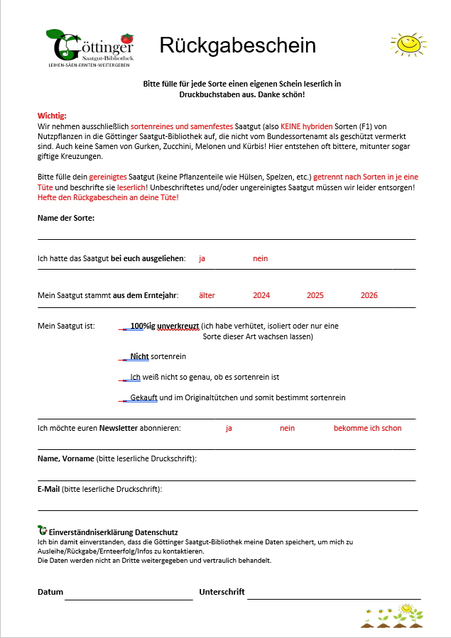 Wir freuen uns sehr, dass ihr euch entschieden habt, Saatgut bei uns auszuleihen und die Vielfalt der Pflanzen zu unterstützen. Damit wir gemeinsam dafür sorgen können, dass die Göttinger Saatgut-Bibliothek weiter gedeiht und wächst, möchten wir euch bitten, ein paar Regeln zu beachten::